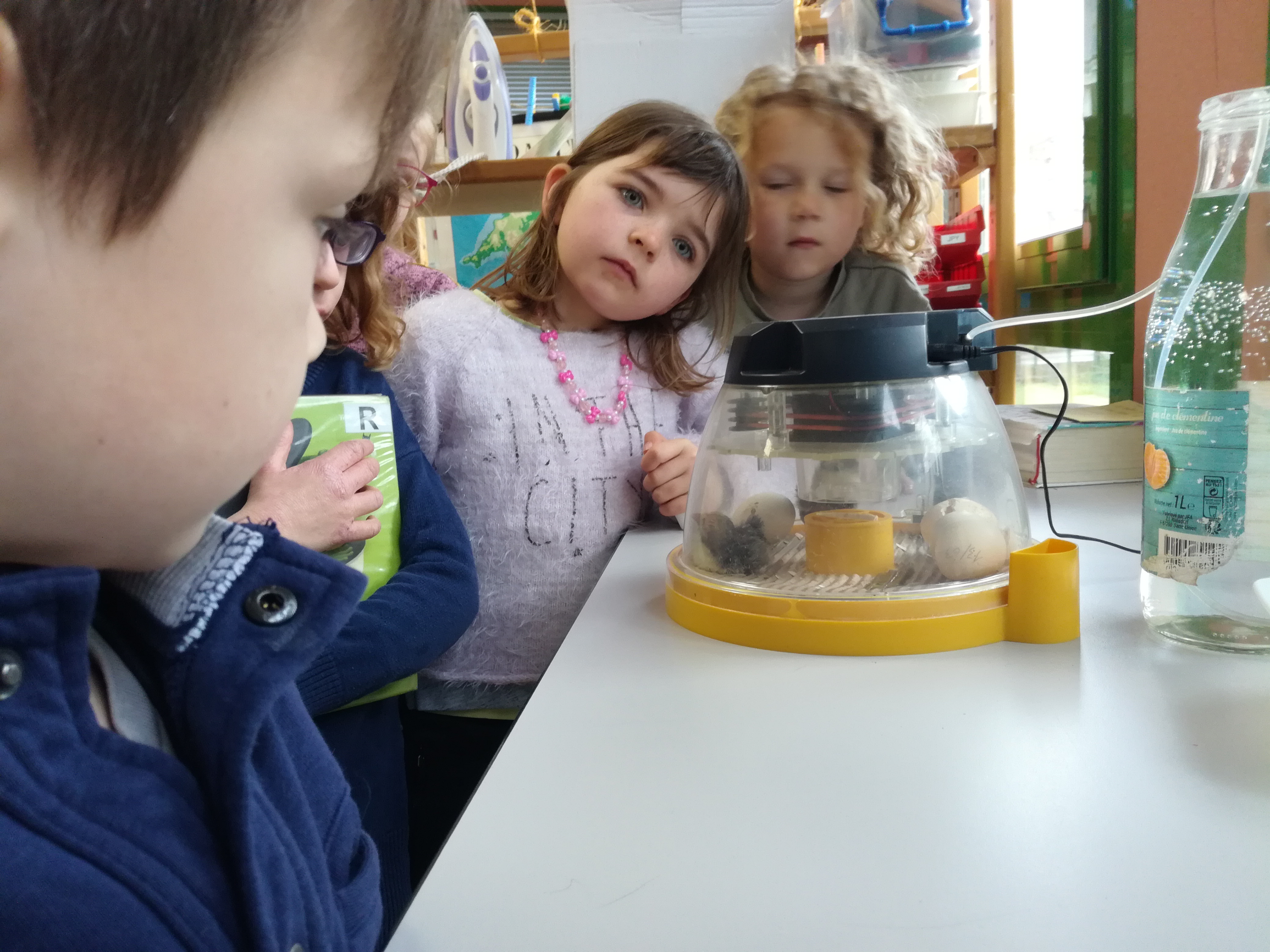 Et ce jeudi 7 avril au matin, une surprise nous attendait à notre arrivée en classe : 2 poussins étaient déjà éclos !