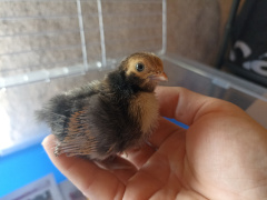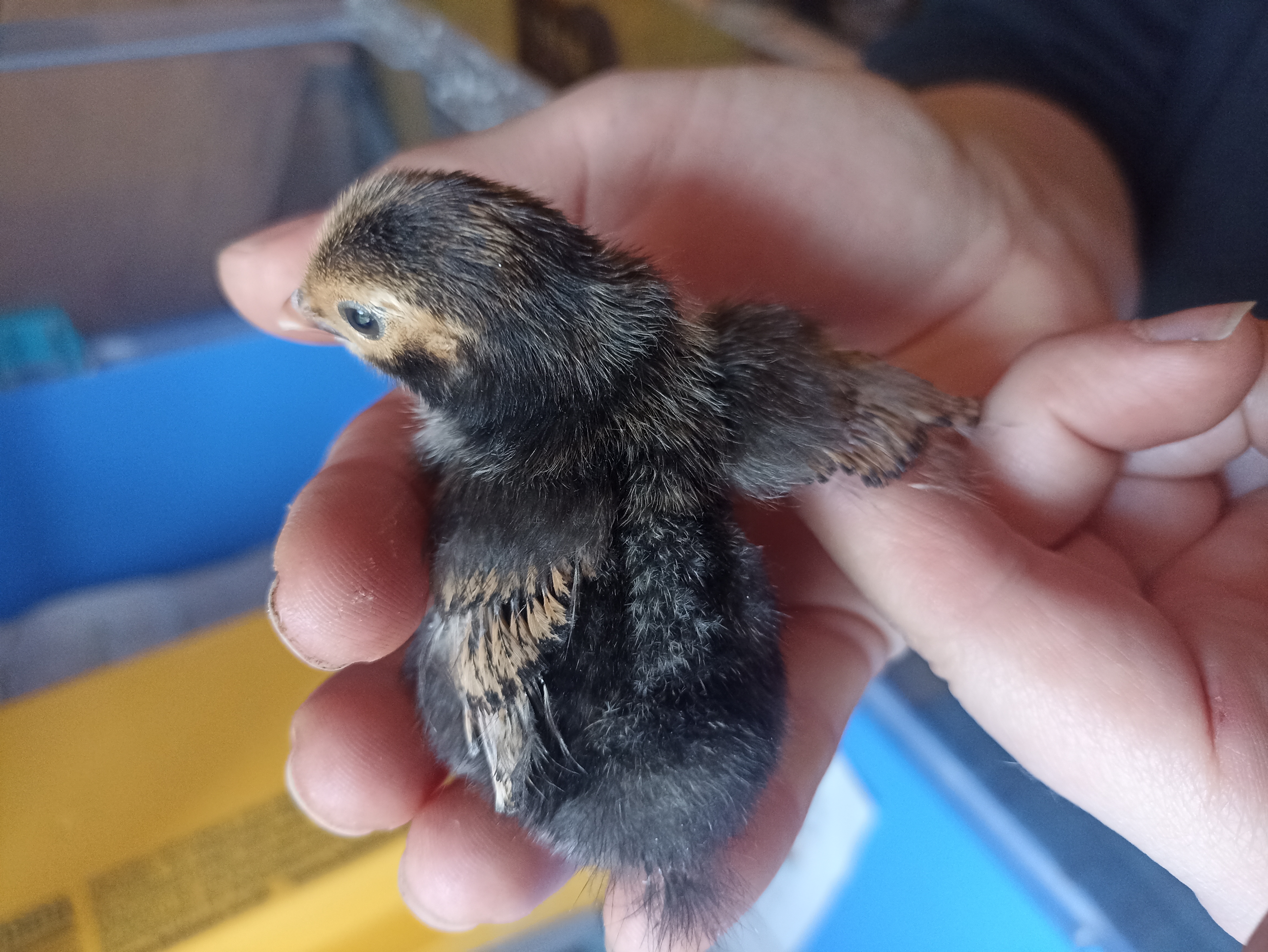 Jour 4 : les plumes des ailes commencent à pousser. Les poussins sont assez vigoureux maintenant pour être pris dans les mains. Mais doucement ! Ils sont peureux.