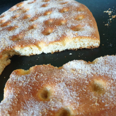 Une fois qu’elle a doublé de volume, dégonflez un peu la pâte, reformez là, puis versez la dans un moule ou sur une plaque de cuisson, préalablement huilé et fariné. Creusez-y des trous en enfonçant votre doigt à plusieurs endroits. Dans les trous, versez de la fleur d’oranger. Saupoudrez généreusement de sucre, puis mettez à cuir au four à 180 degrés pendant 20 minutes.