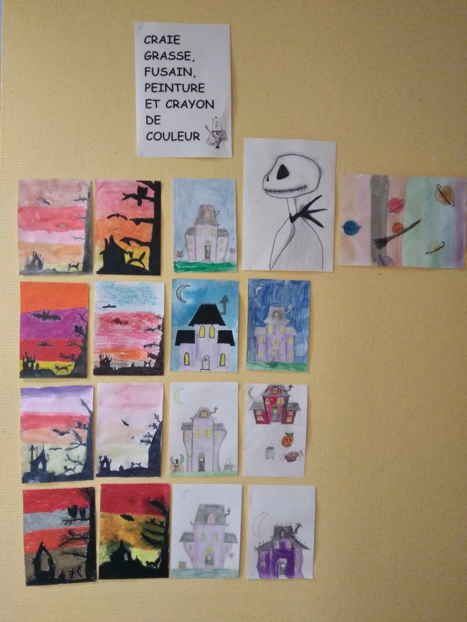 grâce à une feuille avec les étapes, les élèves ont pu créer une oeuvre d’art avec une maison de l’horreur ou un paysage de l’horreur.