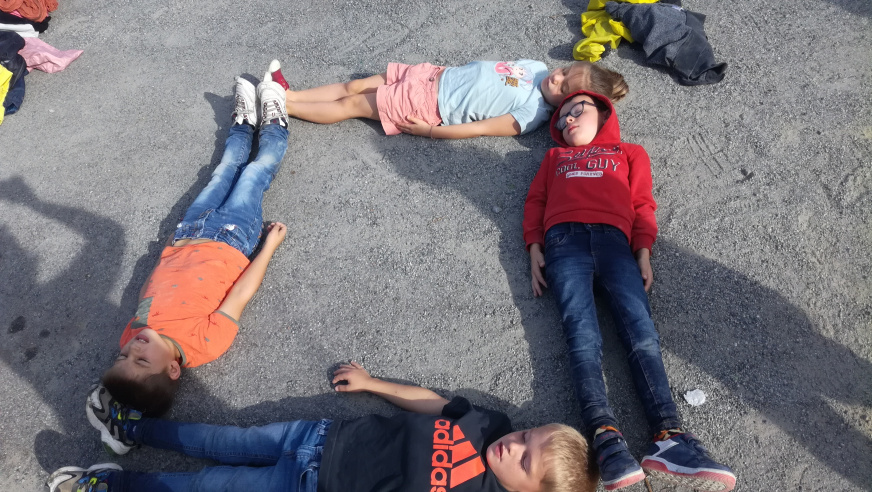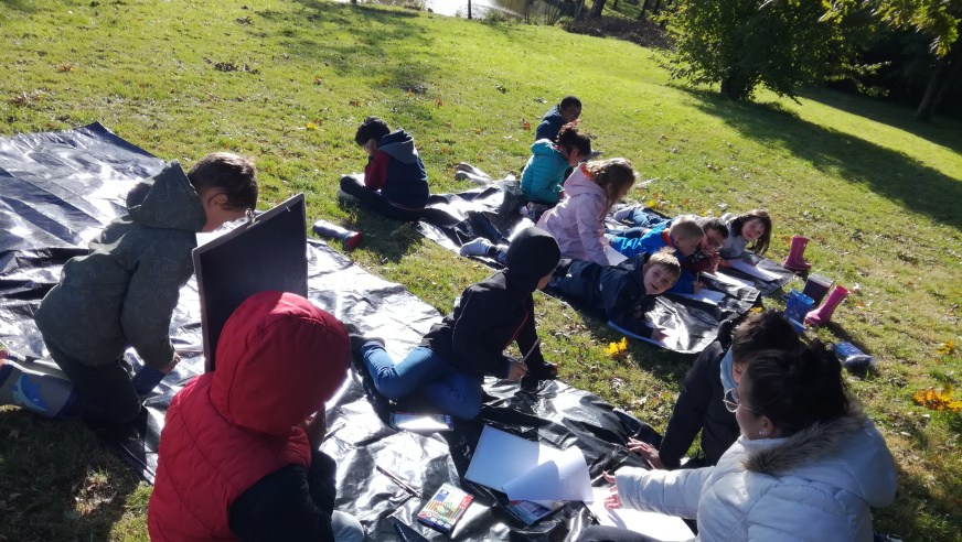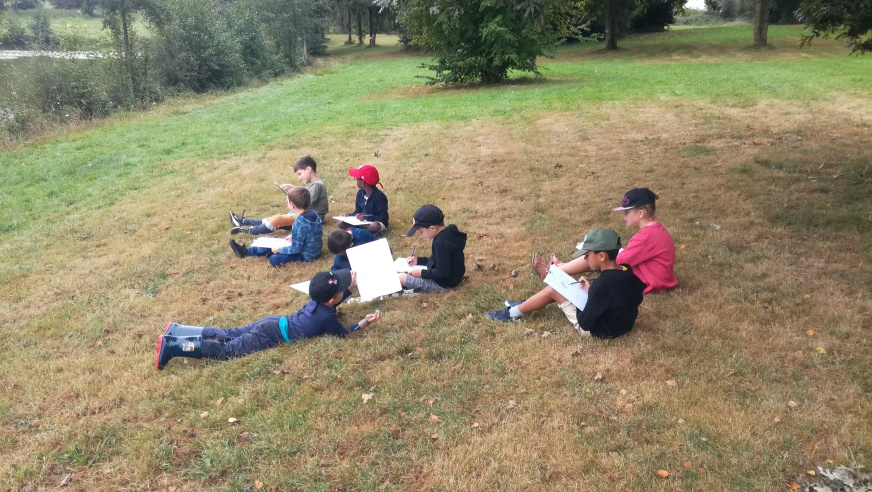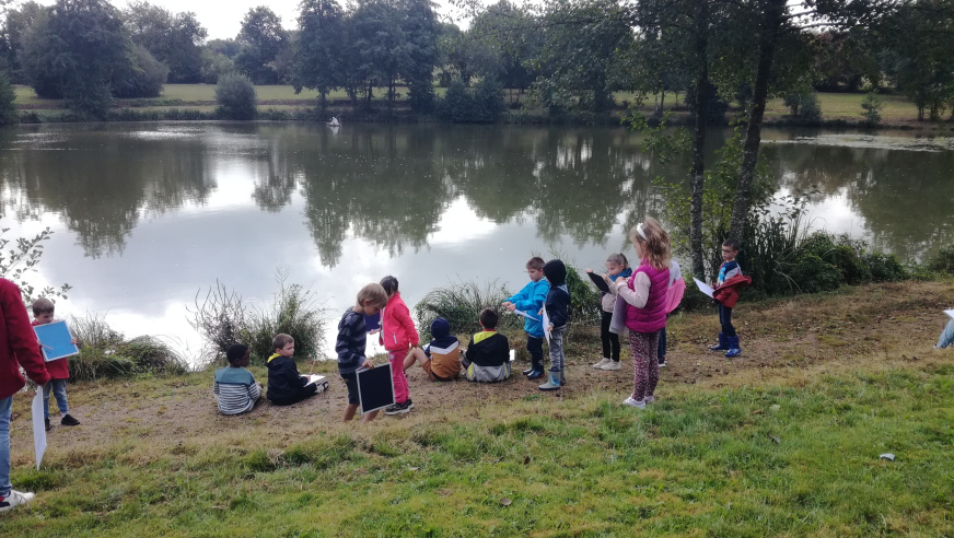 Les CP-CE1 quant à eux sortent de 8h45 à 11h45, qu’il pleuve, vente ou neige, et explorent des espaces un peu plus lointains. En cette première période, la classe avait installé ses quartiers à l’étang de Maxent. Ils ont ainsi pu découvrir l’exposition artistique présente en septembre sur les eaux et organisée par l’association locale « l’échappée belle » : Ce fut l’occasion d’écrire des courriers à différents artistes pour les questionner sur leurs œuvres, et d’échanger avec eux sur les projets à venir.